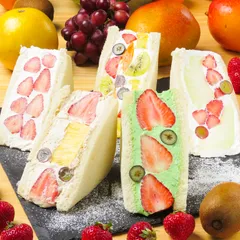 请在我们的水果三明治和蛋糕中享受新鲜奶油和水果的和谐之美。