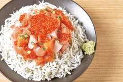 在平底丼上浇上大份量的釜生白寿司。每日特供的腌制生鱼片也值得一提。