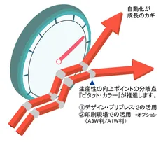 随着印刷品和网络之间的需求日益分化,印刷业不仅越来越多地使用胶版印刷,而且还使用商业数字印刷进行小批量印刷,这就要求大幅提高生产率。同时,由于技术人员短缺,如何减轻迄今为止一直由技术人员承担的色彩校正工作负担也成为一大挑战。