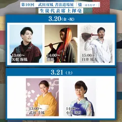由书法家 Soho Takeda 领导的书法道场将于 2026 年 3 月 18 日(周三)至 22 日(周日)在京都乌丸大池岛台画廊举办第 10 次展览 "书法道场展 Hanamuke - hanamuke"。展览汇集了该校学生的 100 多幅书法作品。这些作品既有古典书法,也有原创艺术作品。在 "书法游乐园 "的概念下,展览将为您提供为期五天的书法体验,拉近书法与您的距离。