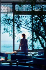 这是一家豪华咖啡厅,透过洒满温暖阳光的大窗户,可以看到波光粼粼的大海和郁郁葱葱的绿色植物。